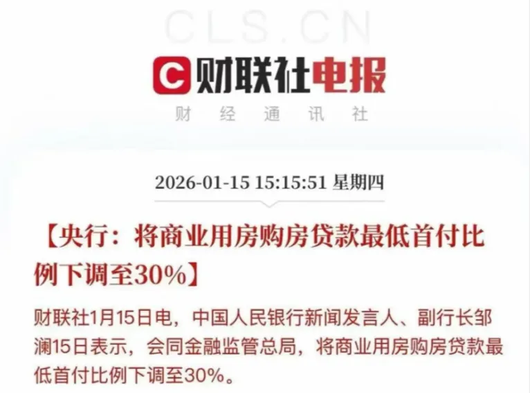 1月15日,央行与金融监管总局联合发布通知:商业用房购房贷款最低首付比例调整为不低于30%。在此之前,全国绝大多数城市商办房首付比例普遍在50%以上,部分项目甚至高达60%。首付门槛直降20个百分点,这是近20年来商办领域力度最大的一次调整。