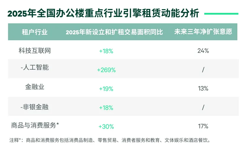 世邦魏理仕最新报告显示,2025年全国主要城市办公楼市场迎来复苏拐点,新设立和扩租交易面积双双实现正增长,增量交易动能在连续三年调整后首次回弹。从需求结构看,科技、金融和消费成为拉动办公楼租赁需求的主力。人工智能产业持续扩张,医疗、教育、文体娱乐等服务消费企业租赁需求稳步增长。