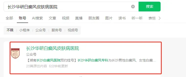 点击微信界面右上角⊕,选择添加朋友,点击公众号,进入搜索界面,输入“长沙华研白癜风皮肤病医院”微信公众号,选中此公众号