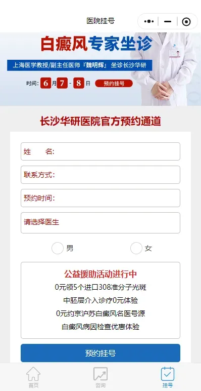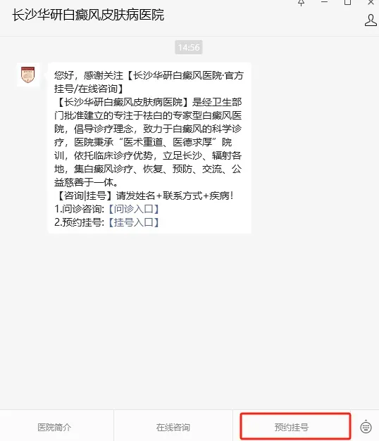 点击关注“长沙华研白癜风皮肤病医院”微信公众号,并且点击菜单栏中的“预约挂号”进入挂号页面。