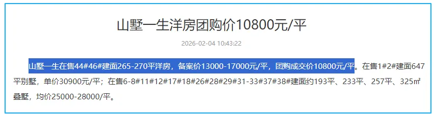 点评:含浦半山,纯别墅+洋房项目,2024年首开时洋房卖到过1.3-1.7万。去年洋房团购价10800,现再次降到9556起,折扣力度非常大。