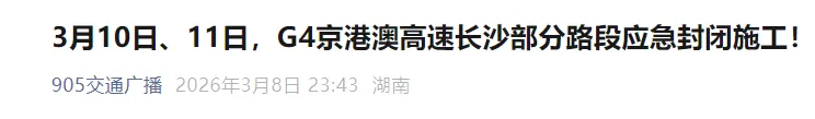因G4京港澳高速应急施工需要,3月10日、11日,该高速长沙广福互通至湘潭昭山互通路段将分阶段进行交通管制,届时请各位及时绕行。