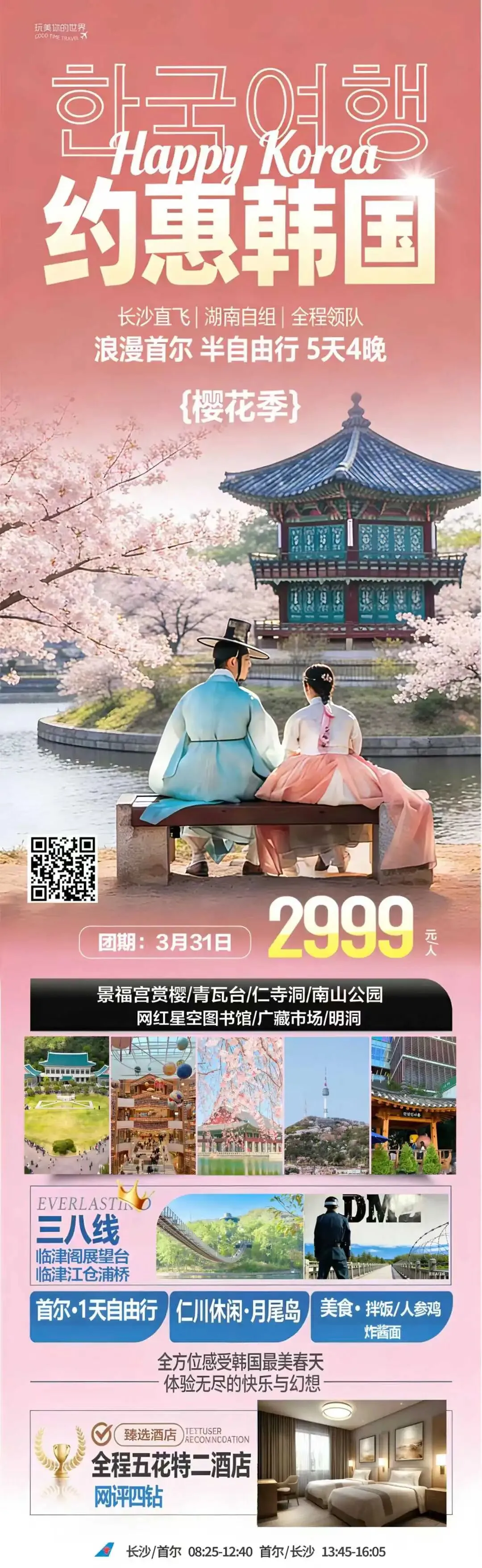 【乐游|韩国】首尔自由行双飞5日游,长沙起止2999+500元(3月31号)