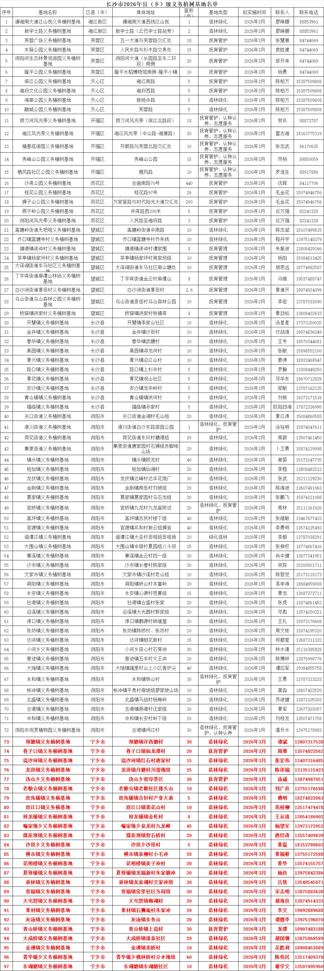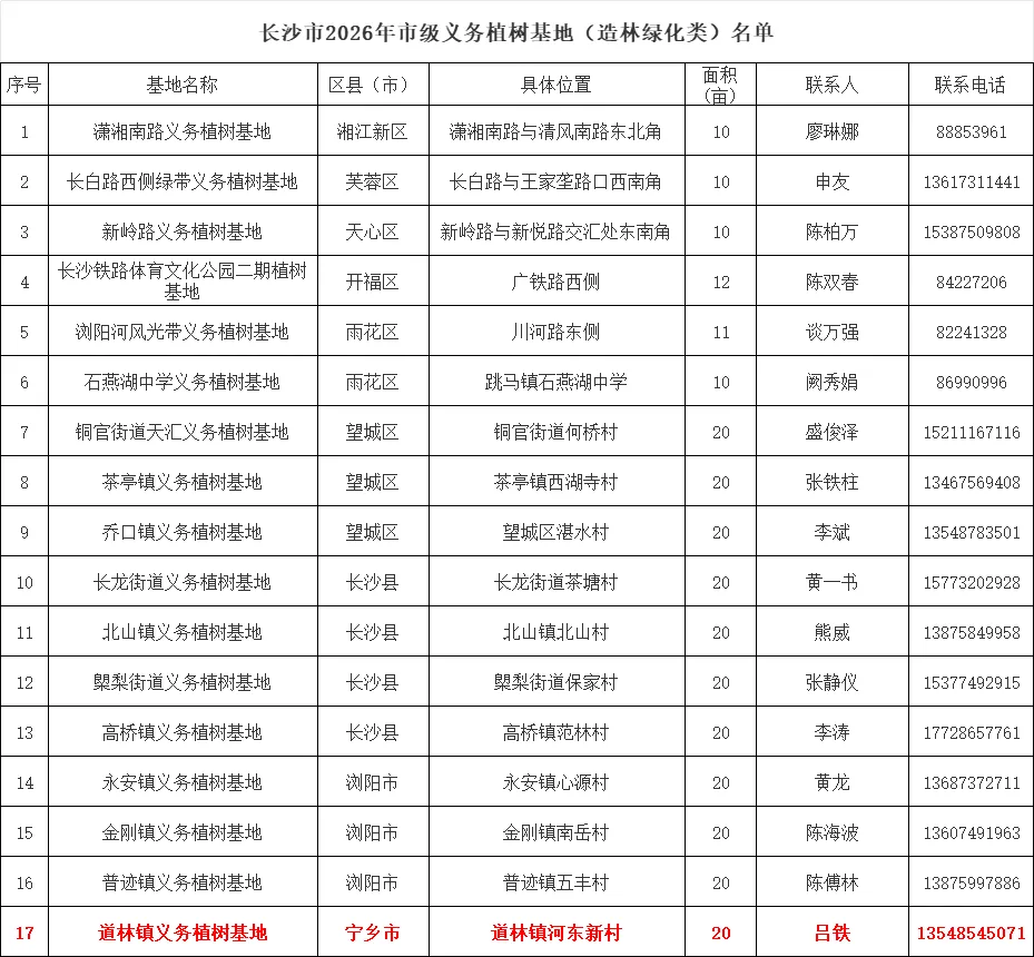 3月12日是第48个中国植树节。3月5日,长沙市林业局发布《长沙市2026年全民义务植树活动总体方案》,全市建设开放义务植树基地114个,其中市级基地17个、县(乡)级基地97个,推出“互联网+义务植树”活动上线100个,其中宁乡1个市级义务植树基地(造林绿化类)、25个县(乡)级义务植树基地,邀请广大市民积极参与植树活动,为星城添绿。
