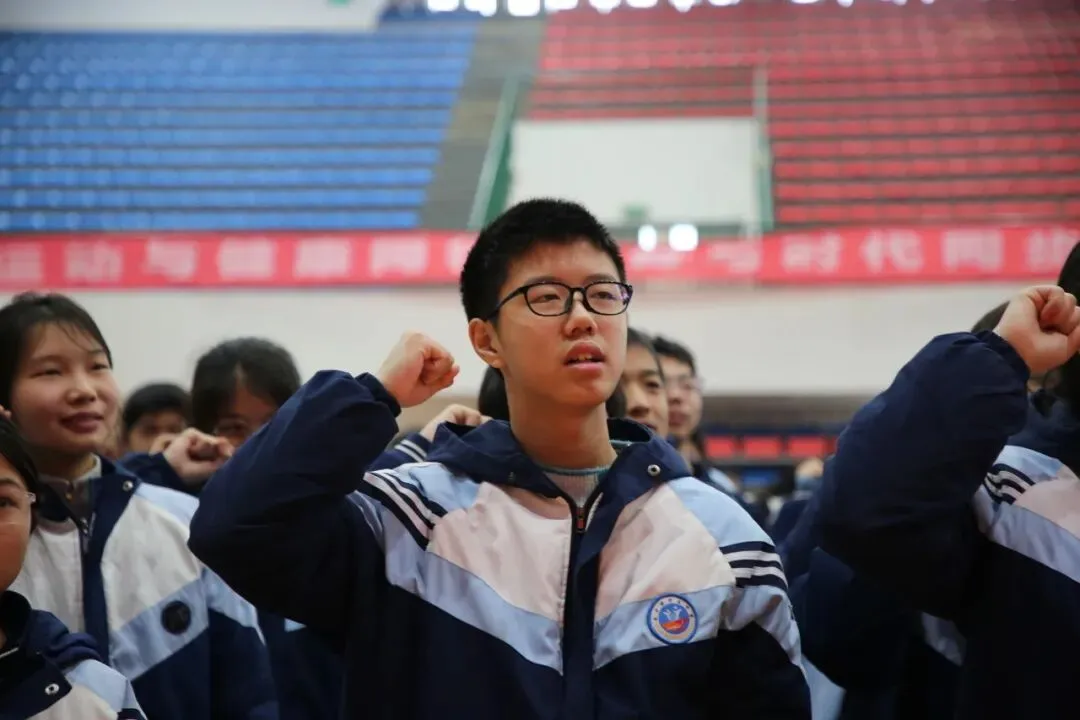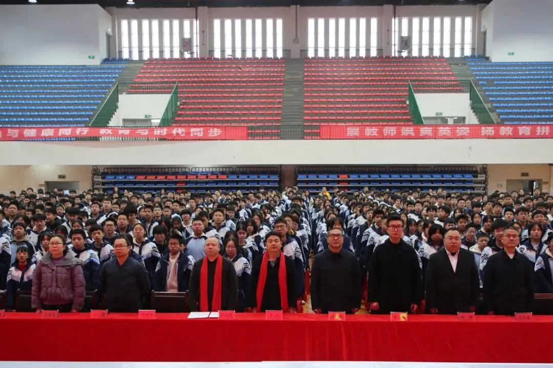 入场完毕,青春成长礼正式开启。全体师生肃立,奏唱国歌,雄壮的歌声在体育馆内回荡。