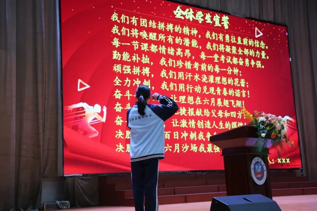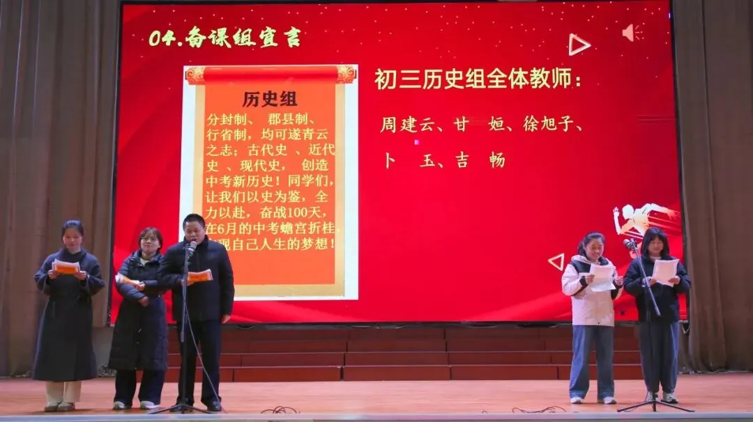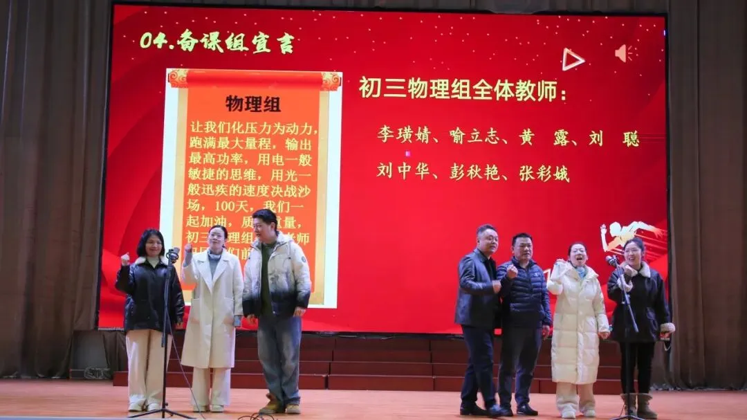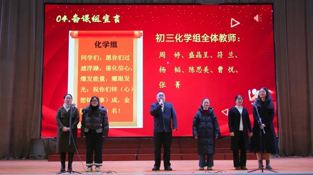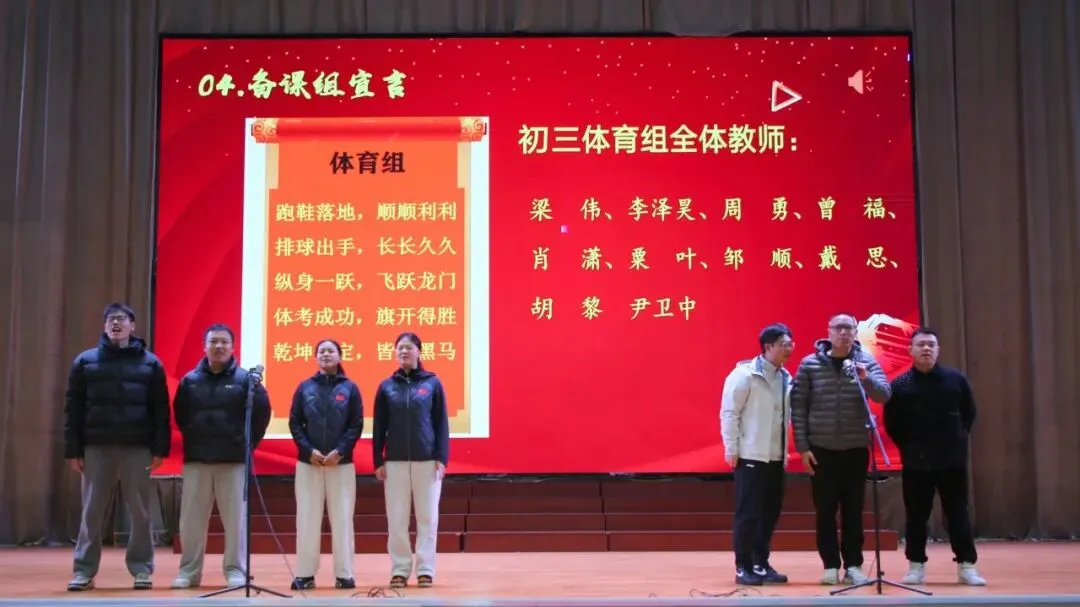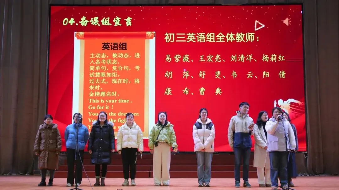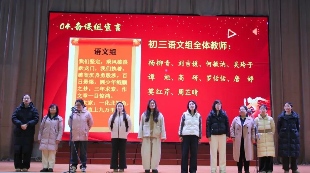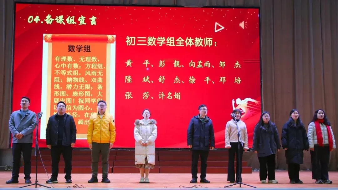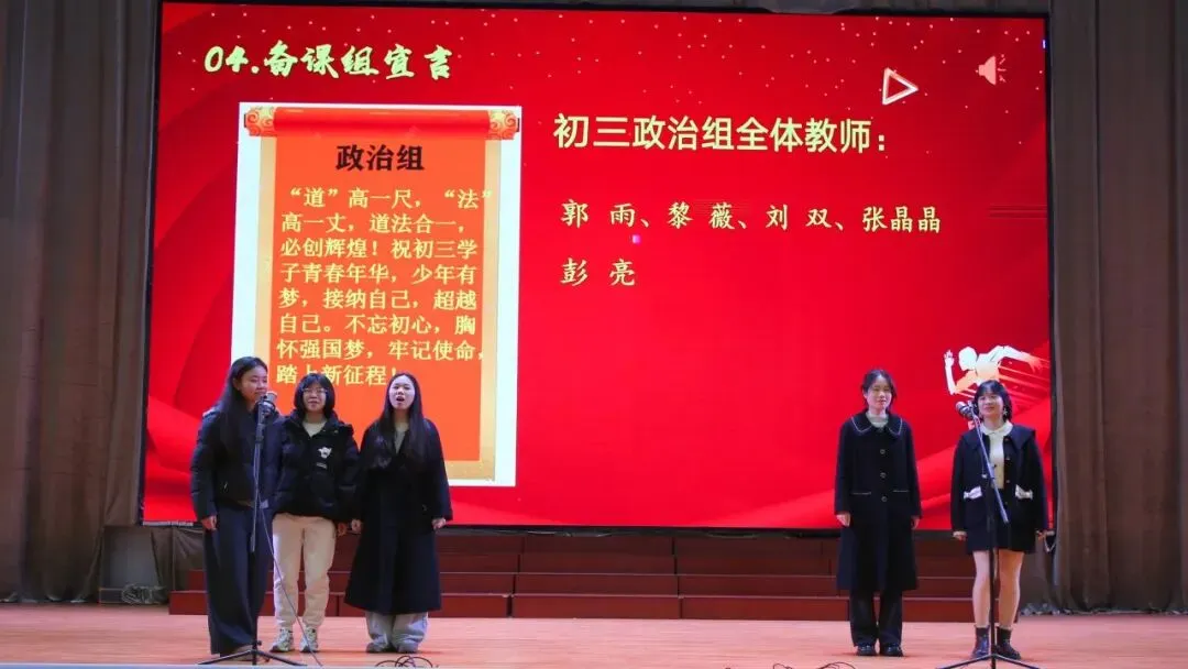 随后,九年级各备课组老师依次登台,带来独具学科特色的成长宣言。语文组的笔墨书香,数学组的理性思辨,英语组的国际视野,理化组的探索求真,史政组的家国情怀,体育组的昂扬朝气…… 每一句宣言,都凝聚着老师们的用心与祝福;每一个身影,都彰显着特立教师的责任与担当。
