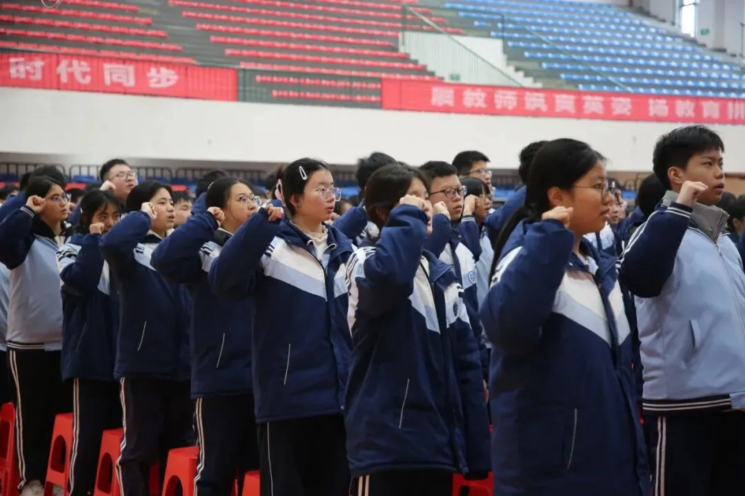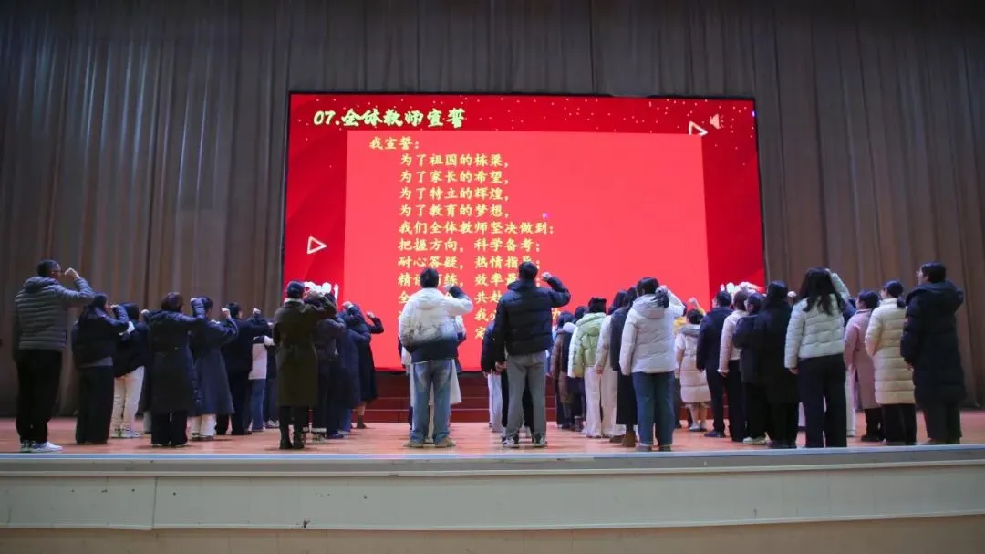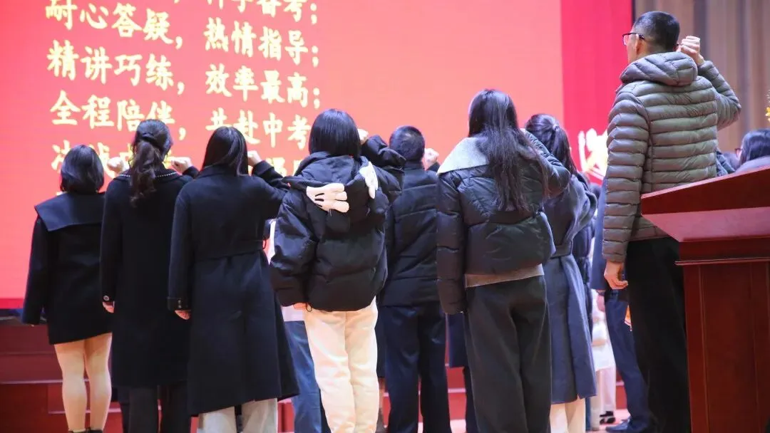 在九年级组长邓培老师的带领下,九年级全体教师庄严宣誓。铿锵有力的誓言,是老师们对教育事业的坚守,更是对同学们成长的郑重承诺。全程陪伴、倾心指导,老师们将以最坚定的姿态,守护少年们的成长之路,与同学们同心同行,共赴成长之约。