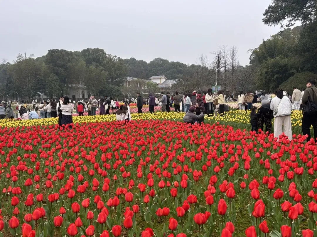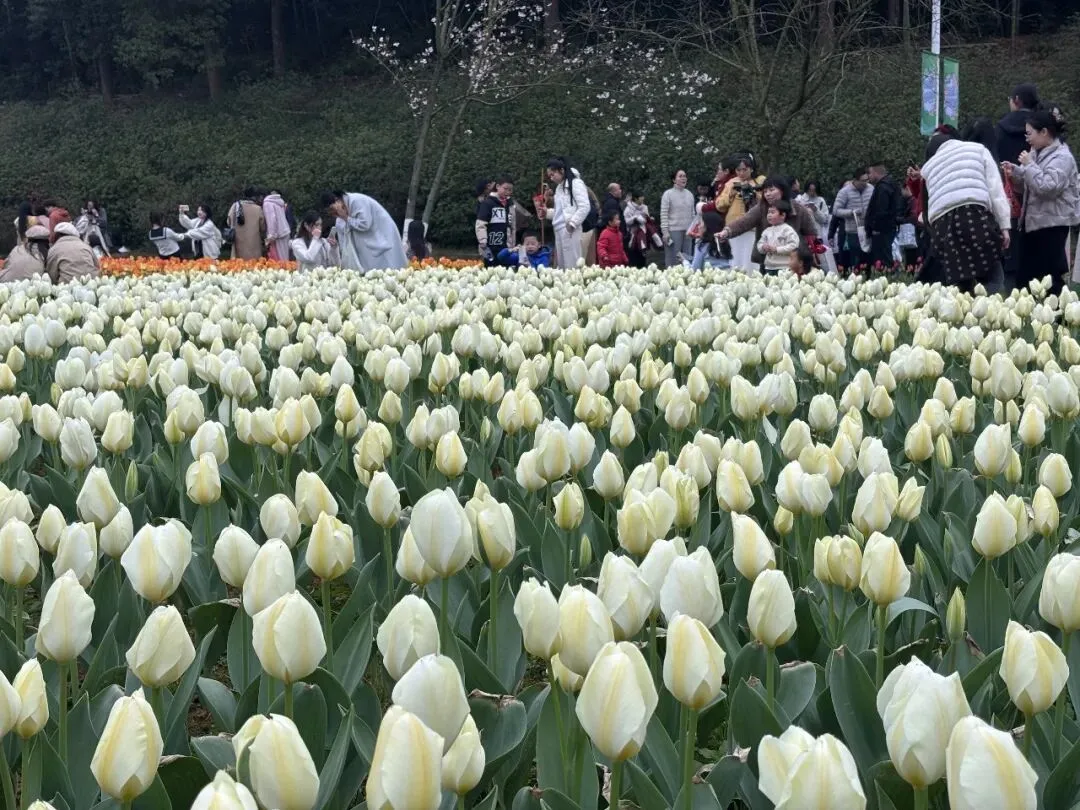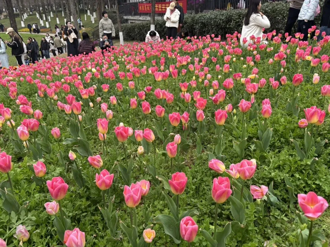观看完表演之后,又继续往园区内走,发现里面还有更大片的郁金香花海,小河旁边还开着粉的、白的樱花,不少游客都在这里拍照打卡。