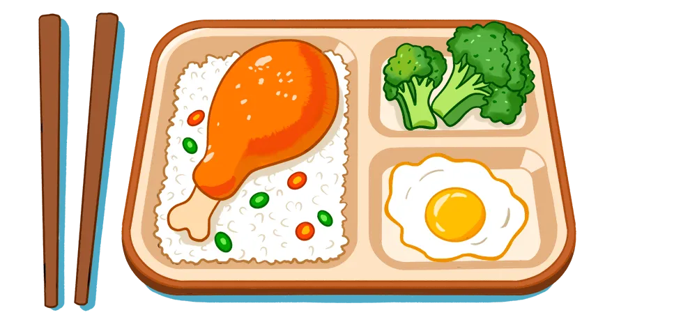 黄焖鸡、油淋茄子、冬瓜烧鱼丸、油麦菜、海带骨头汤
