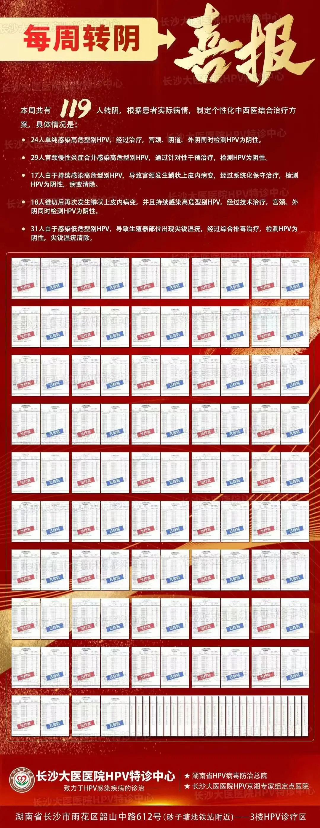 经过京湘HPV专家联合会诊,根据患者实际病情一对一制定个性化中西医结合治疗方案,共有119人转阴,具体情况是: