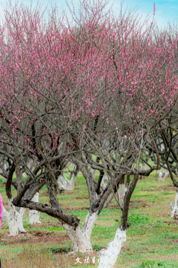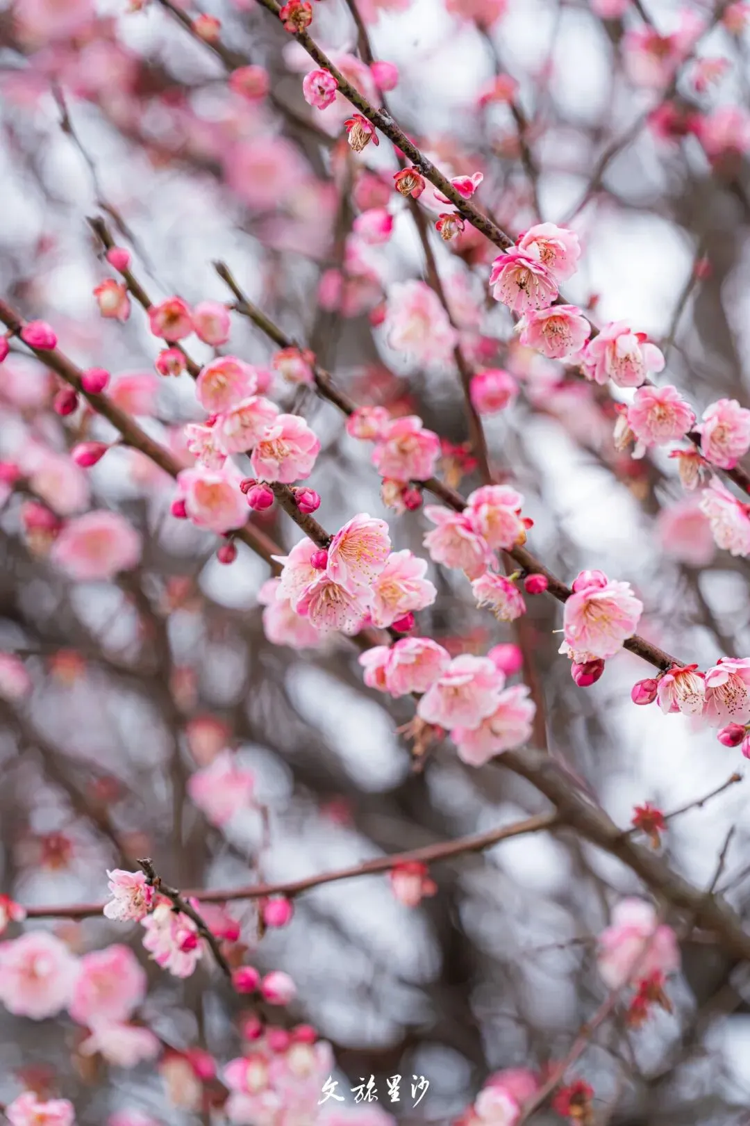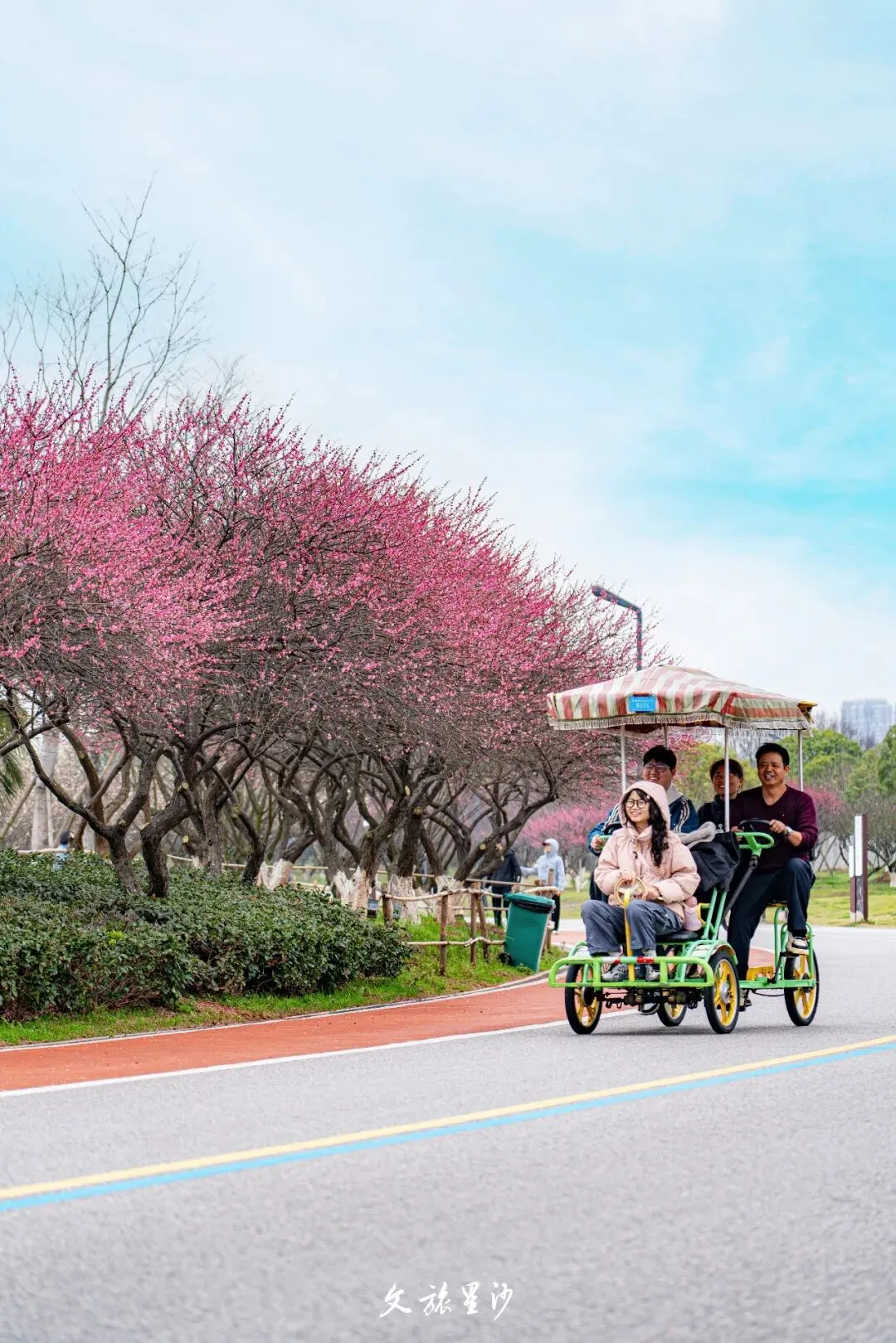 第一站去松雅湖,核心赏梅区在北部沙滩公园,从万明路停车场入口进比较近。湖畔的梅花开得正好,远远就能望见。