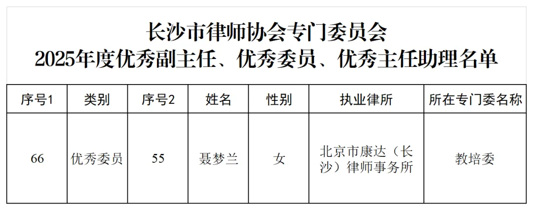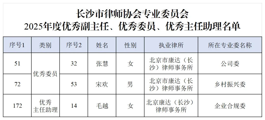 近日,长沙市律师协会正式公布2025年度专门委员会、专业委员会优秀表彰名单。康达(长沙)律师事务所张慧、聂梦兰、宋欢、毛越四名律师凭借扎实的专业能力与突出的行业贡献,分别获评“优秀委员”“优秀主任助理” 荣誉称号。
