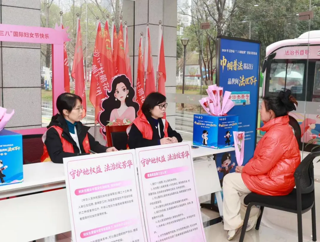 下午14时起,市妇联公交站、雨花区莲湖公交站、汽车西站三大固定站点同步启动普法服务。“长沙市律师协会志愿服务团”为市民提供“面对面”法律咨询,解答婚姻家庭、未成年人保护、反家暴等热点问题,并向过往群众发放普法书籍与宣传资料。