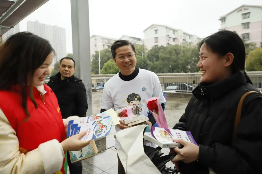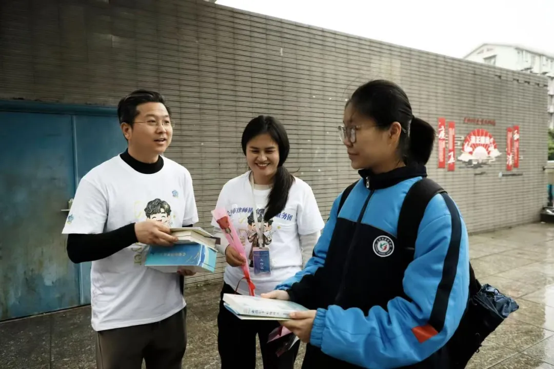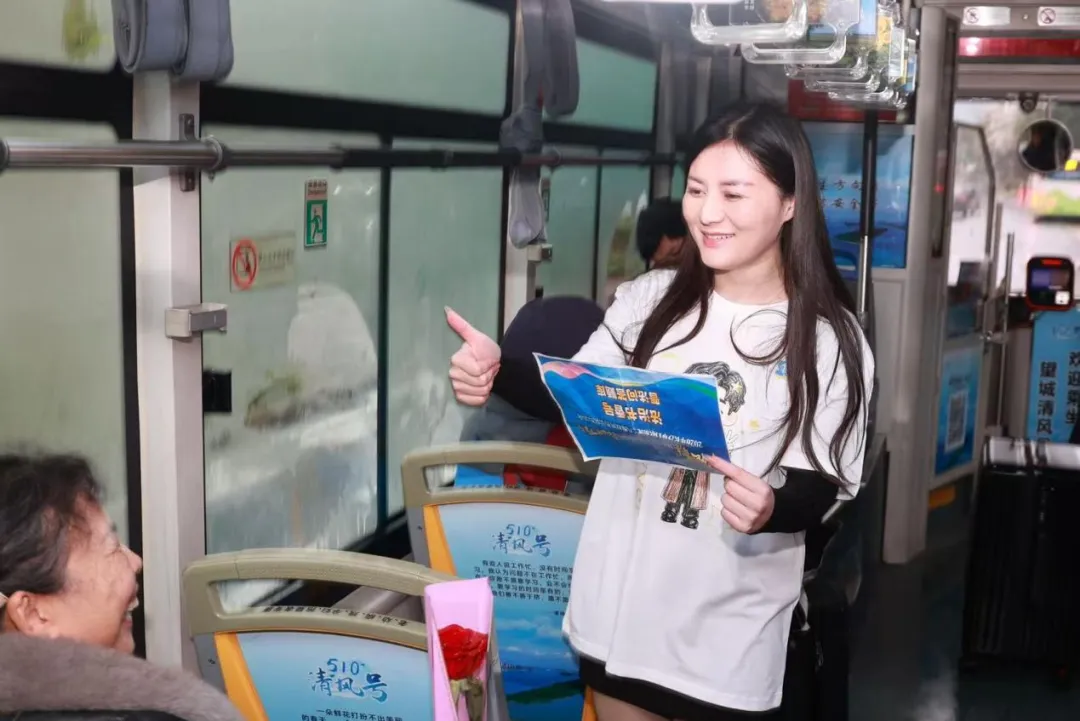 与此同时,38路、28路、3路三条固定线路及随机线路的公交车上,律师志愿者们随车开展沉浸式互动。“考考律师”环节吸引乘客踊跃提问,律师现场解答,参与互动并完成“普法小事”(如转发标语、传递宣传单)的乘客获赠《西游记中的情理法》等普法书籍、玫瑰花及节日祝福。
