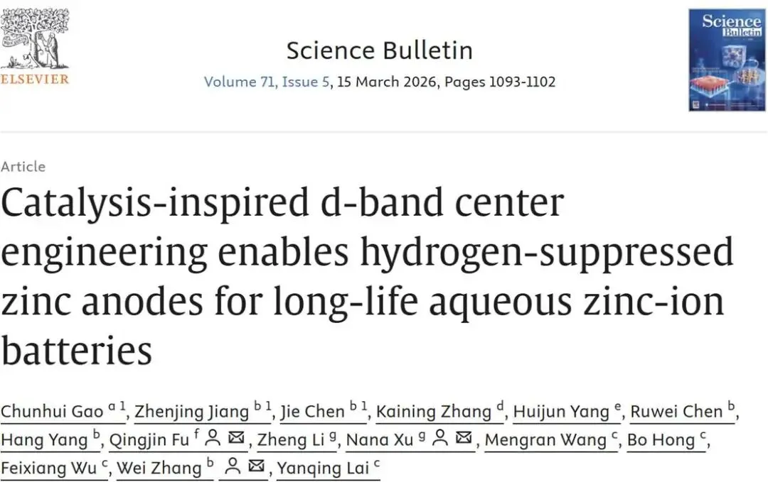 其相关成果以题为“Catalysis-inspired d-band center engineering enables hydrogensuppressed zinc anodes for long-life aqueous zinc-ion batteries”在国际知名期刊《Science Bulletin》上发表。