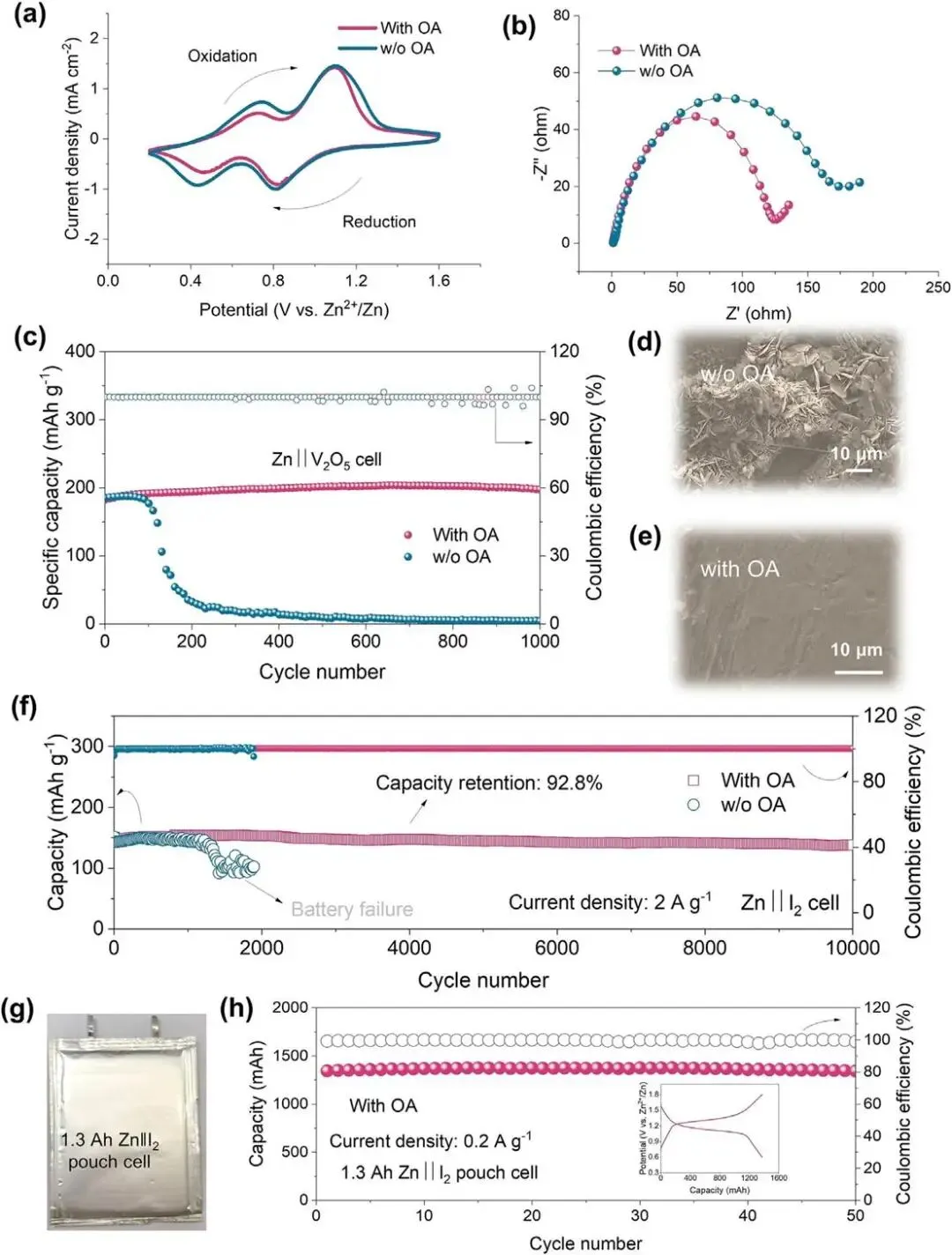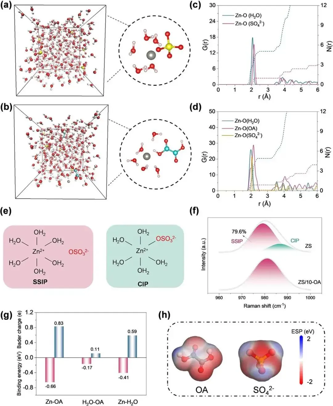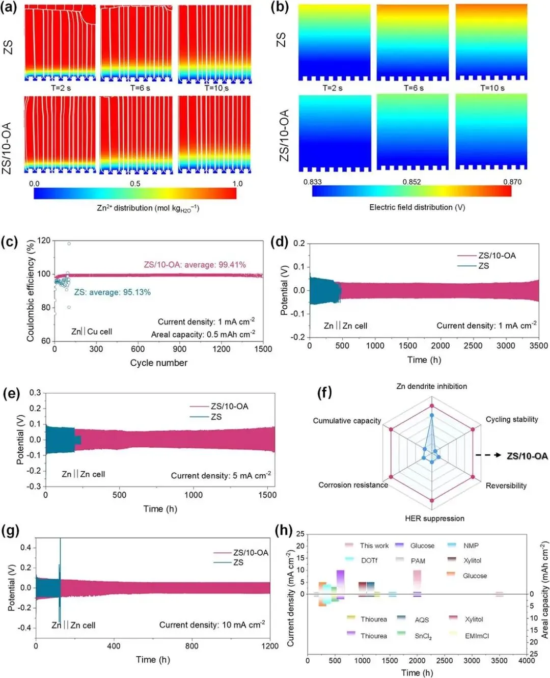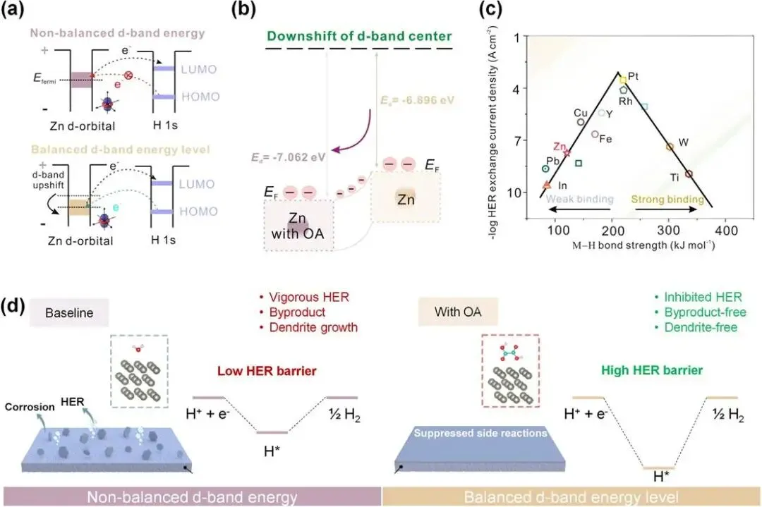 水系锌离子电池(AZIBs)作为一类有前景的电化学储能体系,其商业化进程受限于锌负极的多重失效机制,包括枝晶生长、析氢反应(HER)及界面副产物(如碱式硫酸锌)的不可控生成。其中,HER不仅加速锌金属消耗,还诱发局部pH升高与电解液分解,进而加剧电极钝化与结构退化。现有策略主要集中于电解液工程与人工界面层构筑,但尚未从电子结构层面系统调控锌表面HER本征活性。长沙理工大学高春晖团队受多相催化中d带理论启发,提出一种基于d带中心调控的电子结构设计策略:引入草酸(OA)作为分子添加剂,使Zn的d带中心下移0.166 eV(由–6.896 eV降至–7.062 eV),显著削弱H*吸附能,从而从热力学与动力学上抑制HER;同时,OA通过竞争配位作用解构Zn²⁺溶剂化鞘层,有效抑制碱性副产物在界面的沉积。该协同机制赋予锌负极卓越稳定性:Zn||Zn对称电池在1 mA cm⁻²/1 mAh cm⁻²下稳定运行超3500 h;Zn||Cu半电池1500次循环库伦效率达99.41%;Zn||I₂全电池10,000次循环后容量保持率高达92.8%;1.3 Ah软包电池亦实现200次循环无明显衰减。本研究首次将催化d带理论延伸至水系金属电池电极/电解液界面,确立了“电子结构—界面反应—宏观性能”的构效关系,为高性能锌基电池的设计提供了新范式。