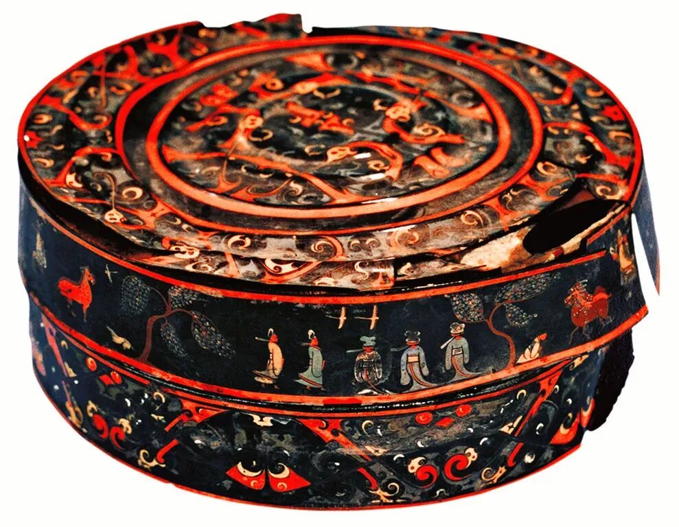 战国 彩绘人物车马出行图圆奁 1987年湖北荆门包山2号墓出土 湖北省博物馆藏