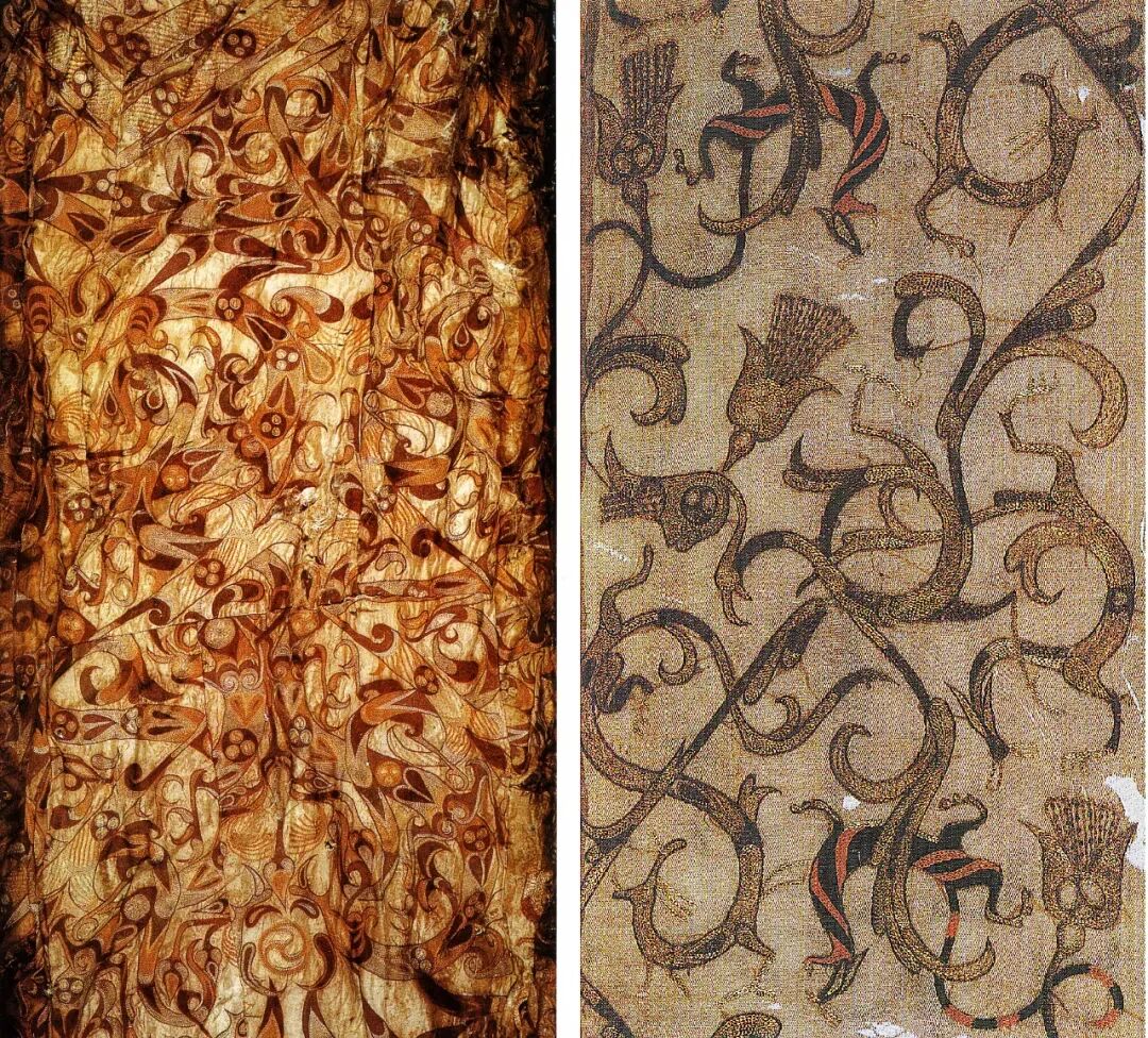 左图:蟠龙飞凤纹绣浅黄面衾(局部) 湖北荆州马山 M1 出土战国(公元前 475 ~前221 年)