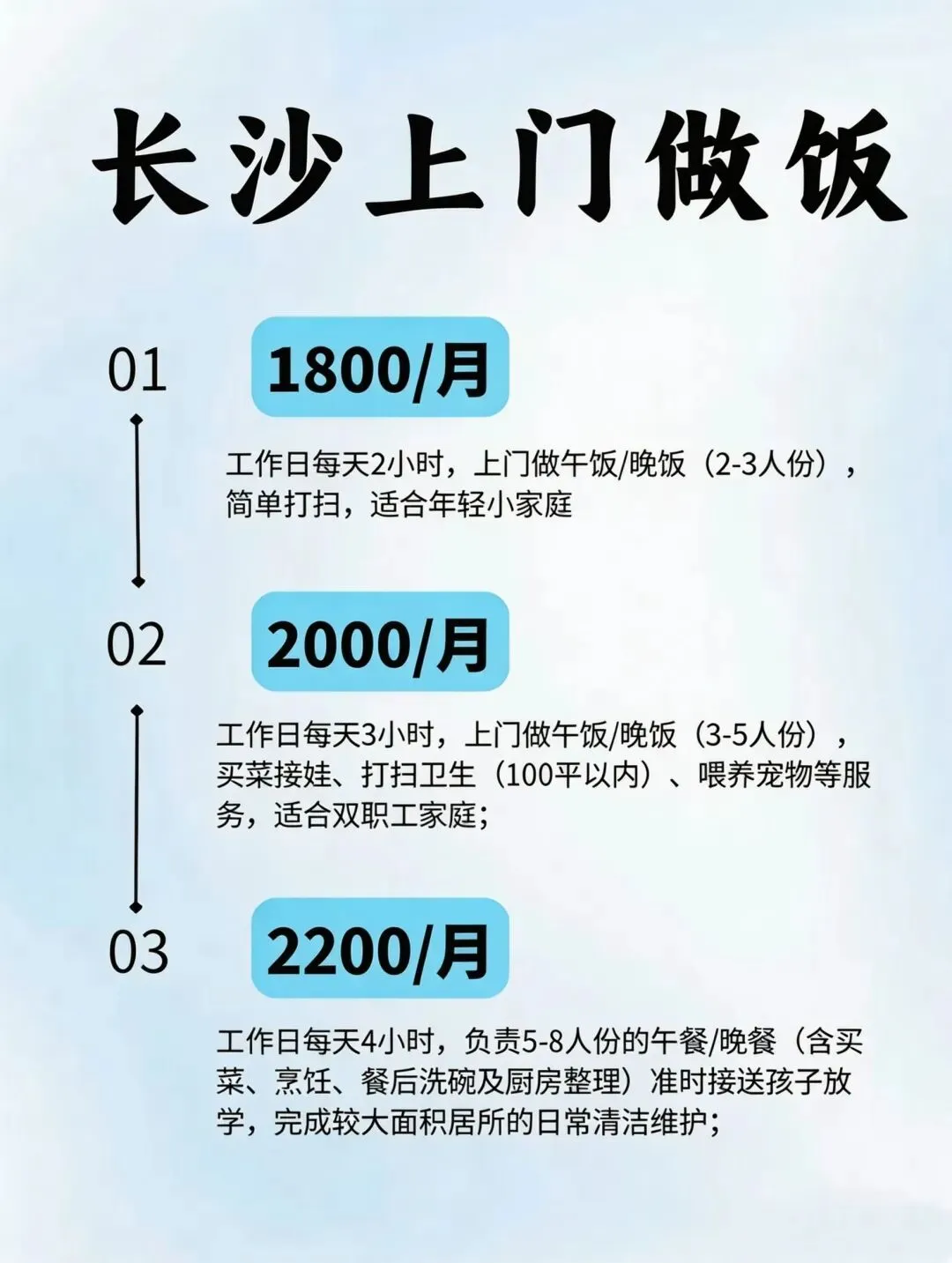 ▪️2小时:工作日每天2小时,上门做午饭/晚饭(2-3人份),简单打扫,适合年轻小家庭、独居青年,再也不用天天吃外卖啦;
