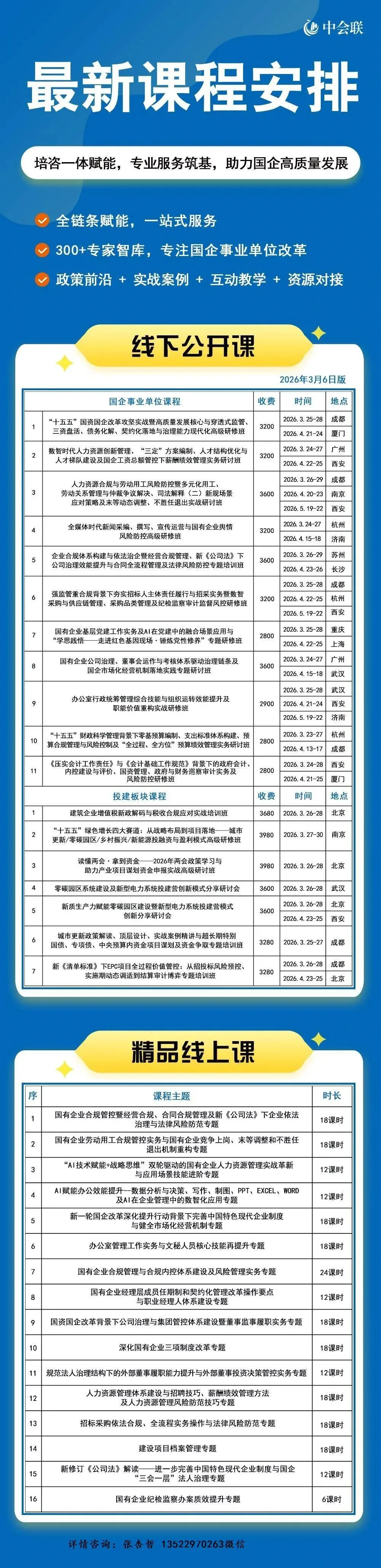 合规管理与风险管理体系建设是在深化国资国企改革攻坚及高质量发展目标驱动下确保国有资本安全的“生命线”,也是推动改革举措落实核心保障。近年来,国资委以《中央企业合规管理办法》等相关政策为引领,构建“风险、内控、合规、依法治企、责任追究”五位一体的全面合规管控体系,明确要求企业合规体系构建贯穿企业决策、经营管理、业务流程及岗位职责各个环节。准确识别、评估和应对企业风险,确保内部控制有效性,是保障企业财务信息真实可靠、资产安全完整以及经营活动合法合规关键。同时,新《公司法》的修订与实施对公司治理结构、股东权利、董监高职责权利等作出重大调整,重塑企业法律逻辑,对国有企业提出更高合规要求。为帮助各单位相关人员深入理解国资委政策要求与强化企业合规经营意识,严守边界、防范风险,系统掌握合规管控顶层设计与经营合规管理核心知识和技能,为企业合规管理工作开展提供有力支撑,并将合规优势转化为企业治理效能与核心竞争力,筑牢国有资本保值增值与高质量发展的法治根基。为此,中国人力资源开发研究会培训中心与北京中会联管理咨询中心联合定于2026年3月和4月分别在苏州市和长沙市举办“企业合规体系构建与依法治企暨经营合规管理、新《公司法》下公司治理效能提升与合同全流程管理及法律风险防控实战”专题培训,诚邀各单位积极组织相关人员参加培训。