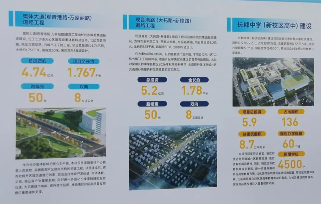 长沙奥体中心配套工程,比如:奥体大道、观音港路、长郡中学新校区等都在同步建设中。