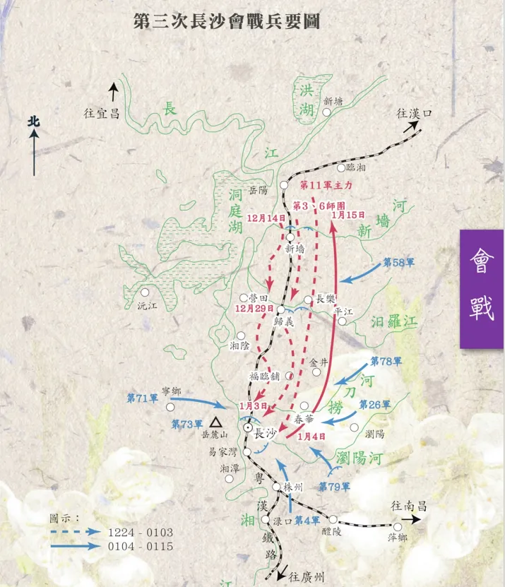 1941年12月,日军第11军为策应第23军进攻香港,牵制第九战区部队南调助英抗日。日军指挥4个师团、2个旅团、3个支队又1个飞行团,共10万人、沿粤汉铁路向长沙进攻。第九战区以13个军37个师共17万人防御。中国军队利用湘北河流布防,重创日军后放开正面,诱敌深入至长沙外围予以痛击。12月24日,日军强渡新墙河,中国守军凭险抵抗,节节阻击。日军于1942年1月4日进至长沙外围,中国军队奋起反击,迫使日军北撤。第九战区全线反击,日军在严重打击下于1月15日撤至新墙河以北地区、第三次长沙会战结束。