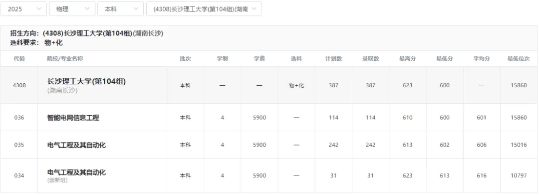 如果你瞄准的是长理的王牌——“电气工程及其自动化”,那你得做好心理准备。2025年这个专业组的录取平均分在湖南省内简直是神仙打架,物理类没个605分+,根本不敢轻易填报。电气创新班最低分数高达613分/省排10797位【性价比太低,这个分数985和中上211都有选择】,这已经不是能不能上的问题,而是你要和多少学霸竞争去国家电网名额的问题。