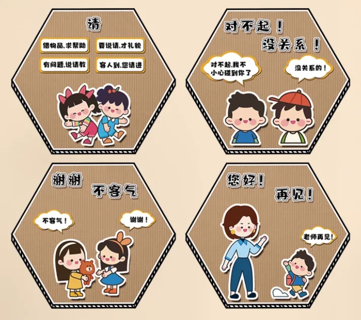 教孩子学会说“请”、“谢谢”、“对不起”、“没关系”等礼貌用语。适当的礼貌用语可以帮助幼儿减少冲突,赢得老师的同学的尊重与喜欢。