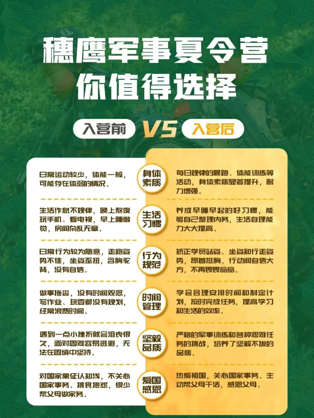 教官队伍均为部队优秀的退役军人组成,并在国防教育、军事化教育岗位上从事多年,积累了丰富的青少年训练经验,流程完备,操作认真规范,具有责任心。所有教官都经过严格的军事基础、四会教学、应知应会知识等的岗前考核。每班配备辅导员,具备青少年教育需具备的耐心、爱心、责任心等基本品质,与孩子全程同吃同住,言传身教。