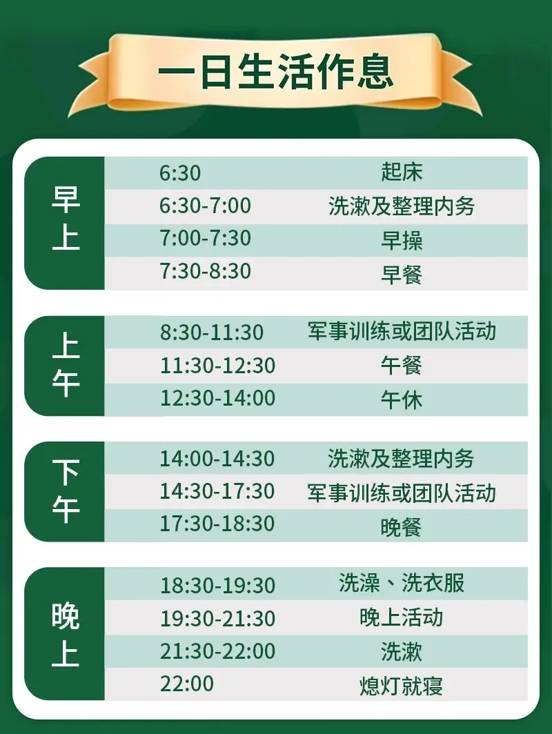 住宿安排:标准的8-10人间,配有:空调,热水器,独立洗浴间,床铺,枕头,被子,保证小战士入营有充足的物资保障。