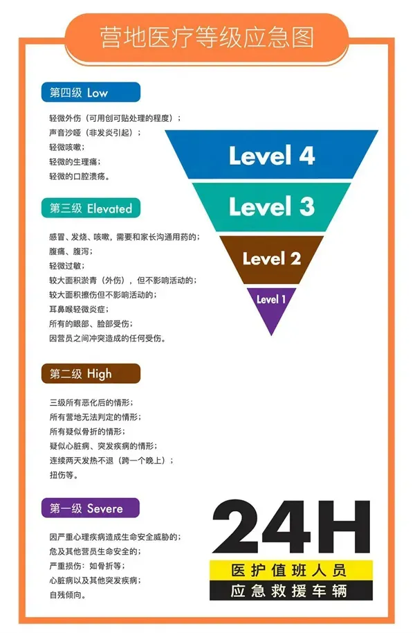 ★如发生以上情况,营地将会根据医疗等级分类及时与家长沟通,并采取相应的措施