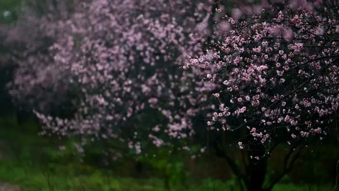 漫步在花间小径,脚下的泥土带着湿润的清香,微风裹挟着细雨,拂过枝头,带来阵阵清雅的梅香。这香气被雨水浸润,愈发醇厚绵长,不浓不烈,却丝丝缕缕萦绕在鼻尖,深吸一口,满心的疲惫与烦躁都被悄然抚平。偶有花瓣被雨珠打落,轻轻飘落在肩头、地面,落红点点,诗意缱绻,无需刻意寻觅,目之所及,皆是温柔。