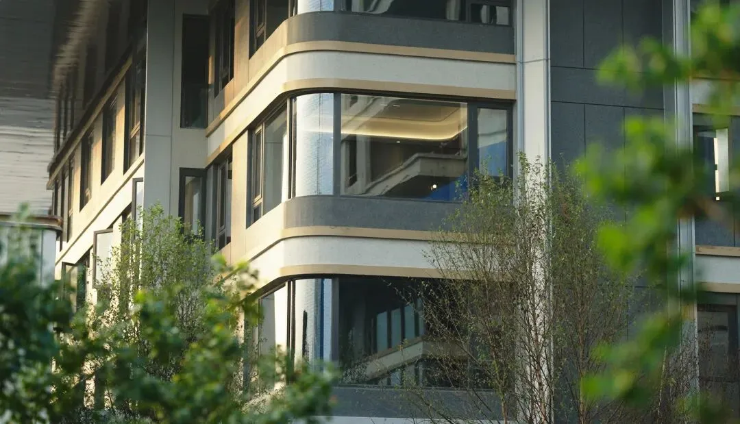 项目采用的是偏公建化立面设计,蓝灰色玻璃搭配金属线条,整体气质会比普通刚需盘更强一些。 尤其是主卧配置的270°弧形玻璃落地窗,是项目比较有辨识度的设计点。