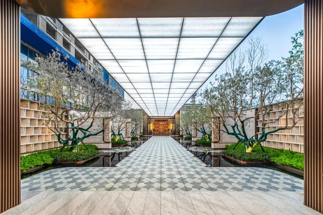 嘉宇这次在公区上投入比较大。 比较有代表性的,是约120米酒店式大门和约2100㎡下沉式艺术会所。会所内部还配置了恒温泳池、健身房、私宴厅等功能空间。