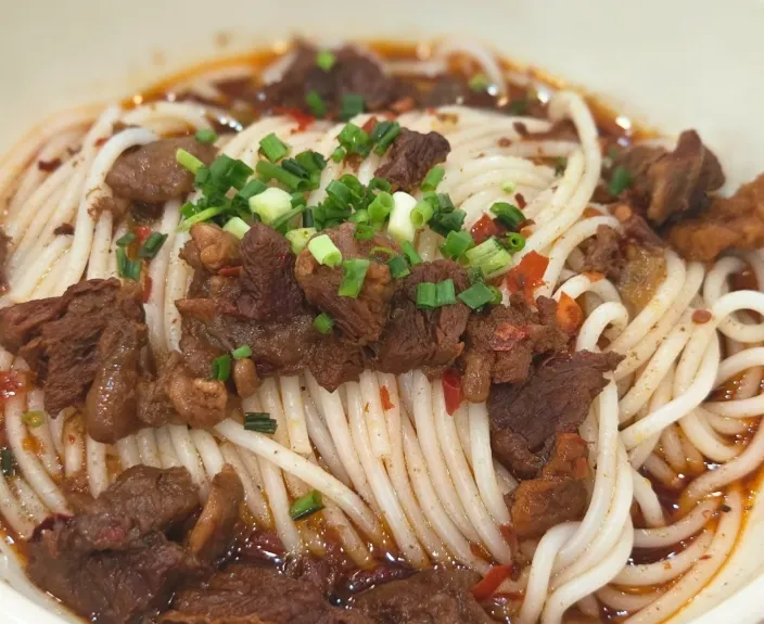 重点说说常德米粉。这不仅仅是食物,是信仰。圆粉洁白圆润,滚水里烫几秒就熟。精华全在“浇头”上,红烧牛肉是大块的,肉烂味醇。红油汤底看着吓人,其实香大于辣。一筷子下去,粉裹着汤,呲溜一口,肉香混合着米香在嘴里炸开,额头微微冒汗,人瞬间就通透了。