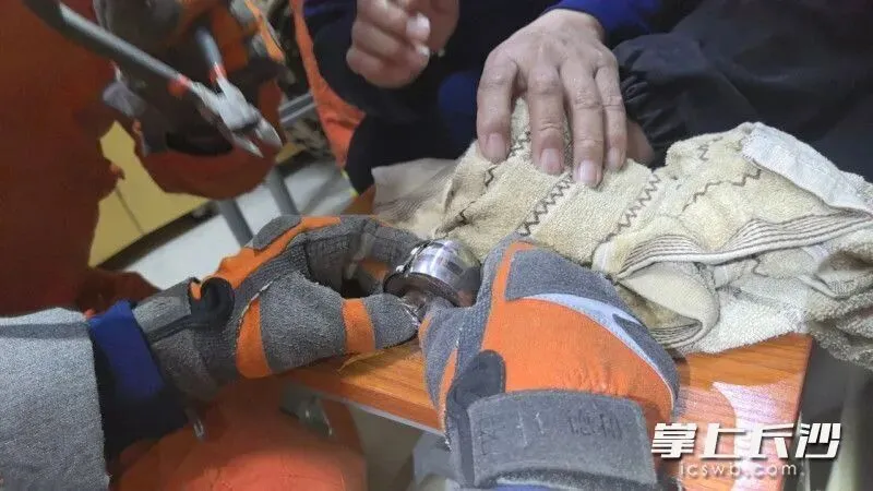 长沙县消防救援大队鹏盛消防救援站接警后,立即赶赴现场处置。到达现场后,指战员发现是一名大学生手指卡在宿舍卫生间门锁芯内不能动弹,该名学生因疼痛难忍不时发出呻吟声。指挥员立即对现场情况进行评估,迅速制定救援方案。救援过程中,一名消防员用携带的切割机先将门把手从门上切割分离,随后在另一名消防员的配合下,用毛巾护住被困者手部,随即用切割机和钳子对切割下来的锁芯进行破拆,施救过程中全程小心翼翼,避免对该同学造成二次伤害,并安抚其情绪。经过10分钟的操作,该名学生成功脱困。