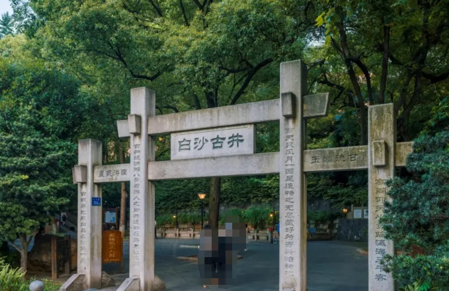 公园大门是一个四柱三洞的牌坊式建筑,中间两柱刻着一副对联,分别是“高天聚风月一园,是造物之无尽藏,好为寄兴怡神地”和“古井媲潇湘八景,看游人之所共适,都在廉泉让水间”,横批为“白沙古井”。