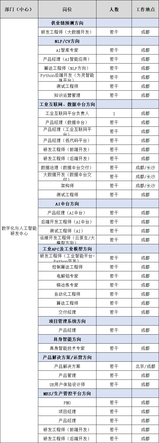 中铝数为(成都)科技有限责任公司(简称中铝数为)是中国铝业集团有限公司(简称中铝集团)全资子公司,是中铝集团数字化转型的承载主体,主要业务包括应用软件、云计算、信息安全技术的开发及技术服务;计算机信息系统集成及相关服务;智能装备、自动化设备、检测设备、仪器仪表、机器人的研发及技术咨询服务;数字化系统运维服务;数字化项目实施等。根据工作需要,现面向社会公开招聘部分岗位人员,现将有关事项公告如下: