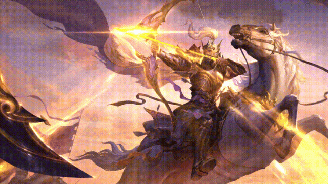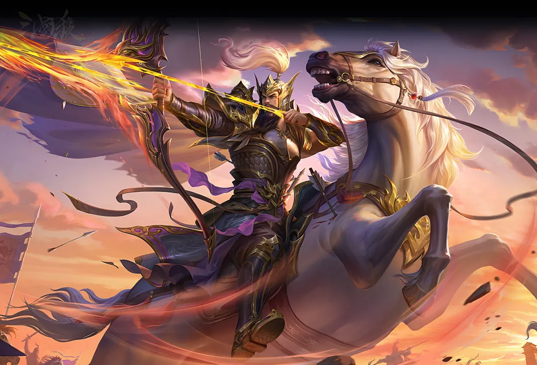 画面中黄忠身披紫金玄铁战甲,头戴雕纹战盔,骑乘的白马呈腾跃姿态,鬃毛如银瀑般飞扬。他一手紧握宝雕弓,一手拉满弓弦,箭尖燃着赤金色的焰光,眼神锐利如鹰,哪怕身处千军万马之中,依旧身姿挺拔、气势如虹,完美诠释了 “长沙阻敌” 中 “阻” 的决绝与 “敌” 的压迫感。燃焰箭簇是画面的灵魂,既对应他 “百步穿杨” 的绝世箭术,又以赤金焰光象征他 “老当益壮” 的热血与战意;背景中隐约可见的长沙城郭与翻飞的战旗,点明了 “长沙阻敌” 的历史背景,每一缕焰光都藏着 “一箭定胜负” 的传奇色彩。