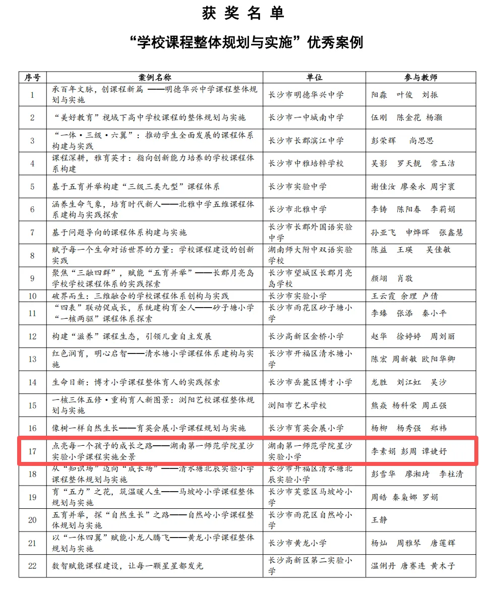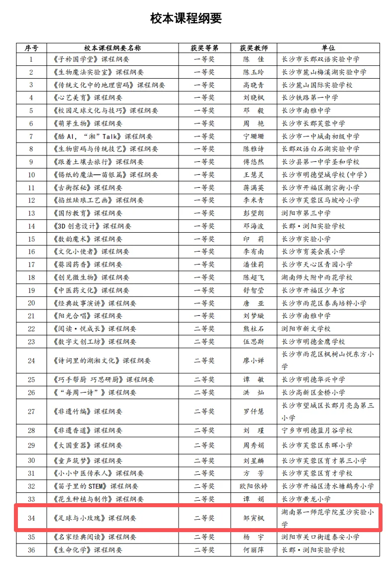 恭喜我校课程案例《点亮每一个孩子的成长之路一一湖南第一师范学院星沙实验小学课程实施全景》获长沙市“学校课程整体规划与实施”优秀案例;《足球与小玫瑰》校本课程纲要获市二等奖;恭喜李素娟、彭周、谭婕妤、邹寅枫4位参赛教师。