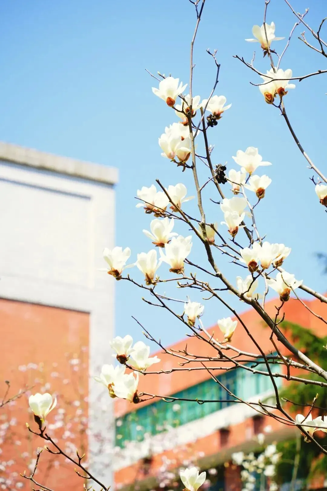 青砖、红墙、白花