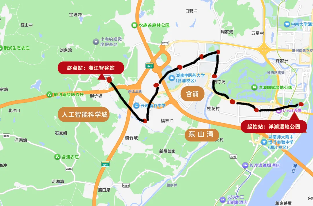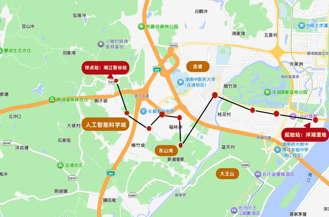 线路规划起点为地铁3号线洋湖湿地公园站,可实现与地铁3号线无缝换乘,终点为人工智能科技城湘江智谷站,全程约10公里。