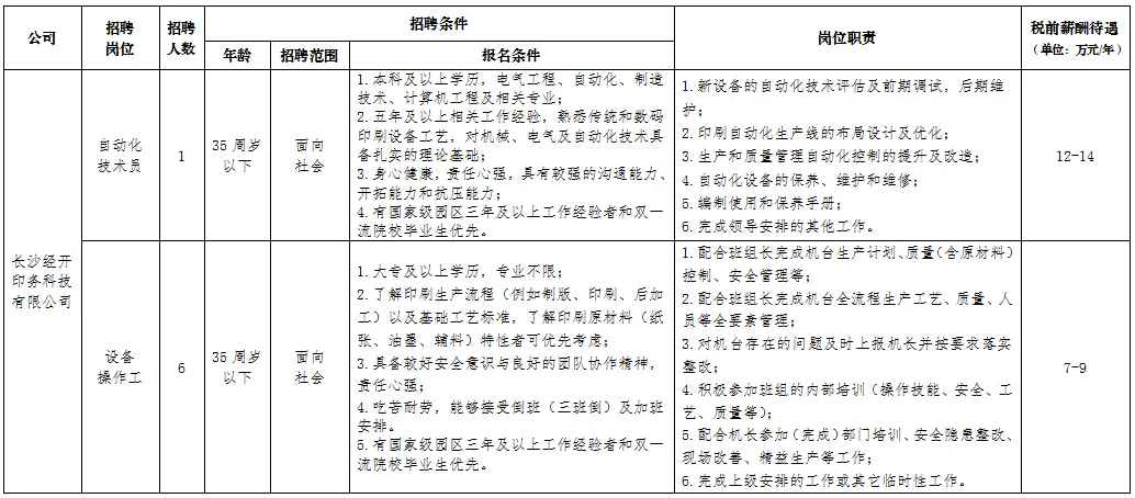 本次共招聘7名工作人员,其中自动化技术员1名,设备操作工6名。具体岗位职责及要求见《长沙经开印务科技有限公司公开招聘岗位及条件一览表》(附件1)。