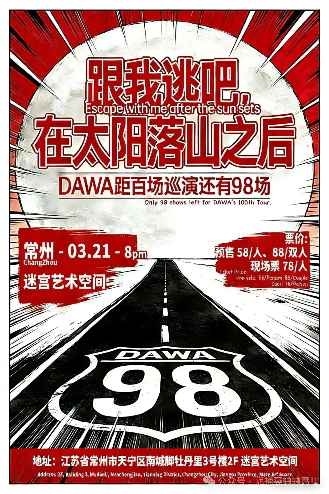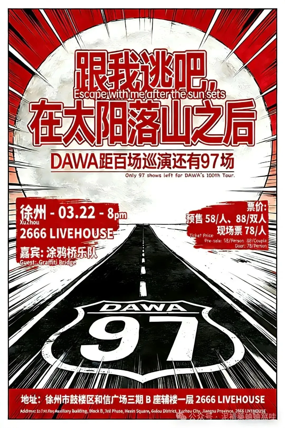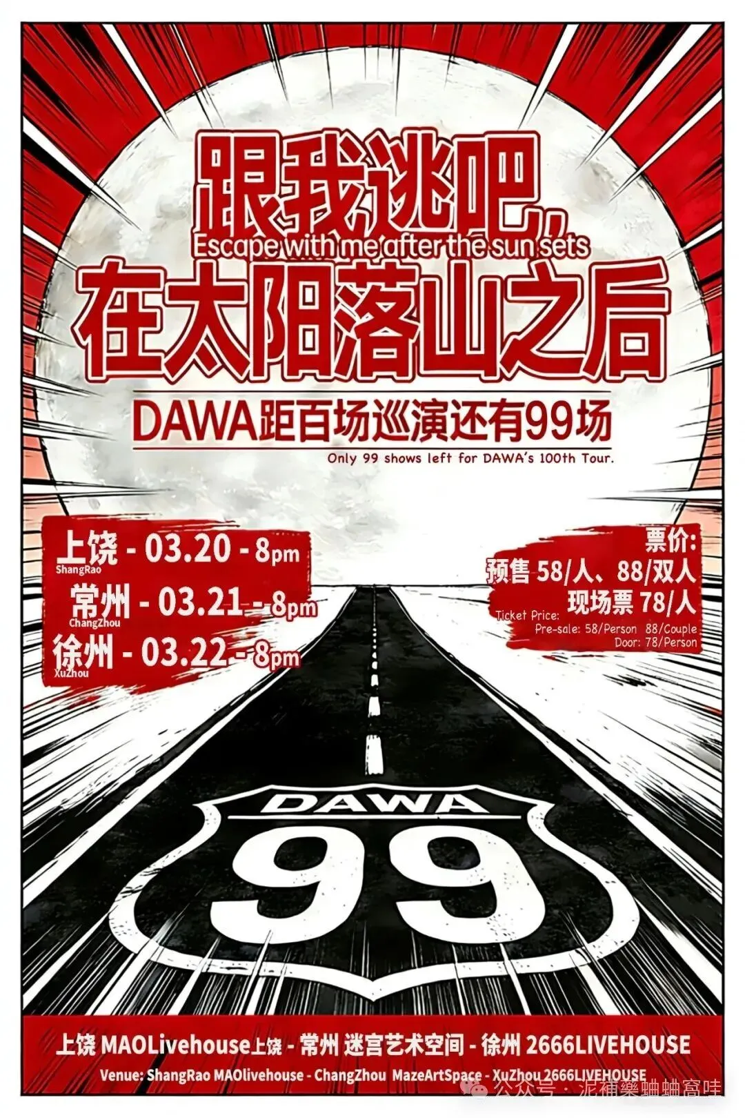 DAWA再次踏上征途,全新百场巡演计划正式启幕,上饶、常州、徐州三城率先开演。这一次,以音乐为炬,以现场为壤,邀你一同奔赴一场属于日落与热爱的狂奔。