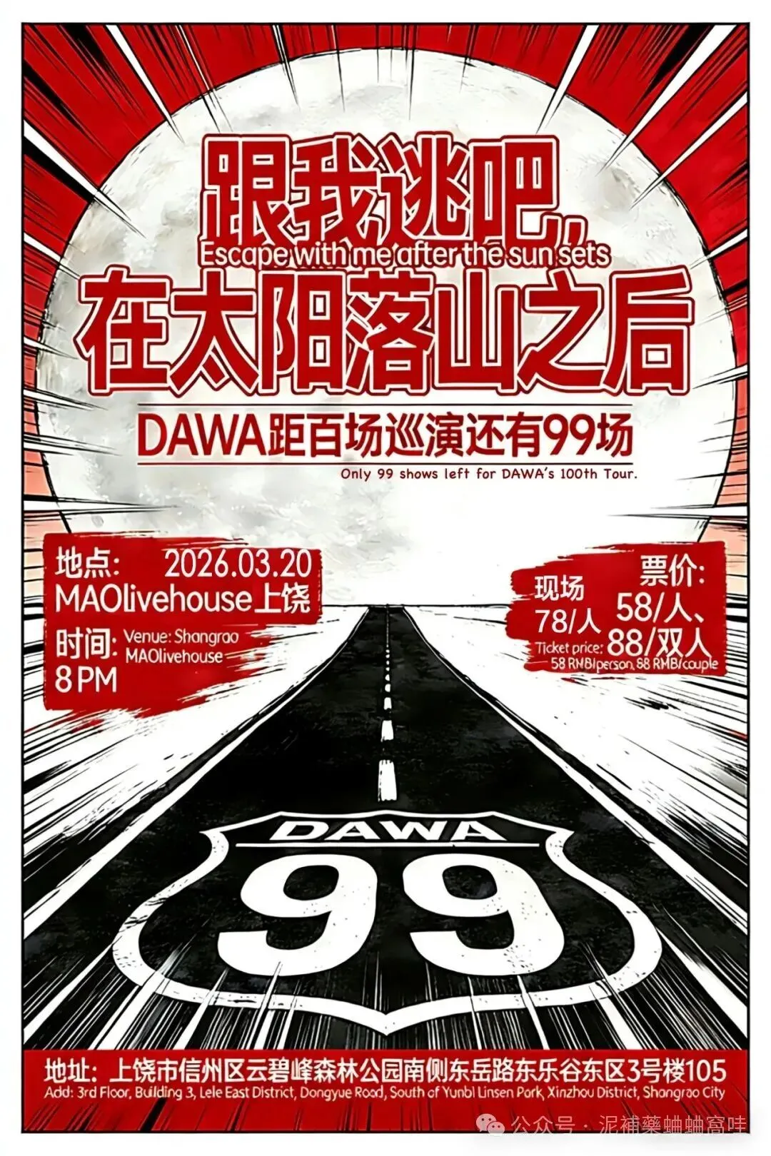 2025年,他们圆满完成首轮“百场计划”,在100个现场里打磨、沉淀,在无数次与观众的共振中迅猛成熟。2026年,DAWA带着倾尽心力制作的全新专辑,再次启动新一轮百场巡演计划。一步一步,一场一场,踏实、坚定地书写属于DAWA的篇章,势不可挡。