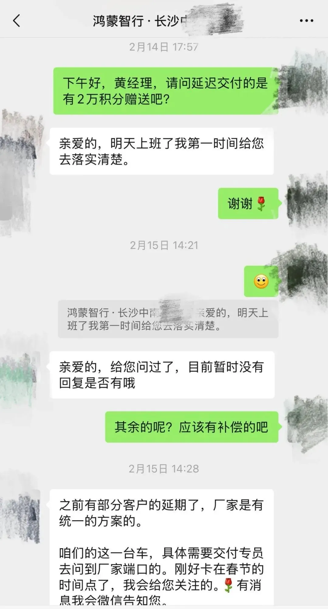 2月24日(农历初八),王女士主动联系长沙鸿蒙智行中南汽车世界店工作人员,双方沟通并不顺畅,赔偿问题无法达成一致。王女士说:“他们态度十分傲慢,我们问新车什么时候可以到,对方一下说3月31日到,一下说3月7日到。我们要求退钱,对方态度就非常强硬,说即使是车损,但车辆已经到店就视同于交付,这5000元没得退。”