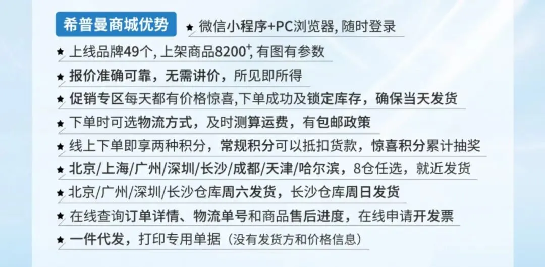 多端便捷下单,不受场景限制;海量商品可选,全图+参数展示,直观对比,选型更高效;灵活物流服务, 一站式售后服务