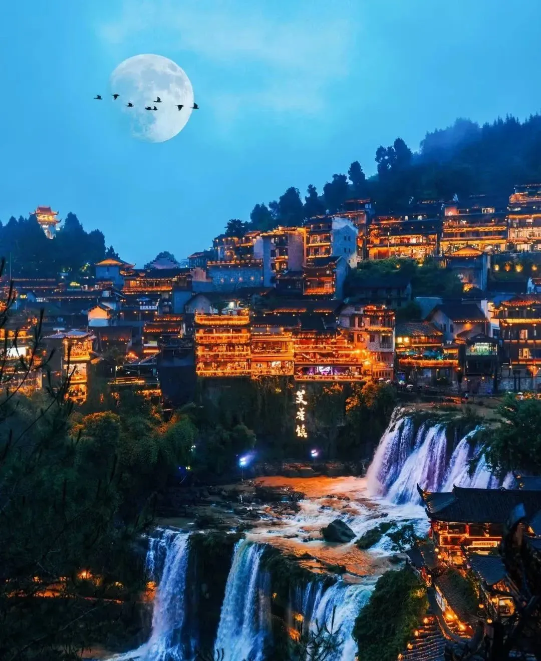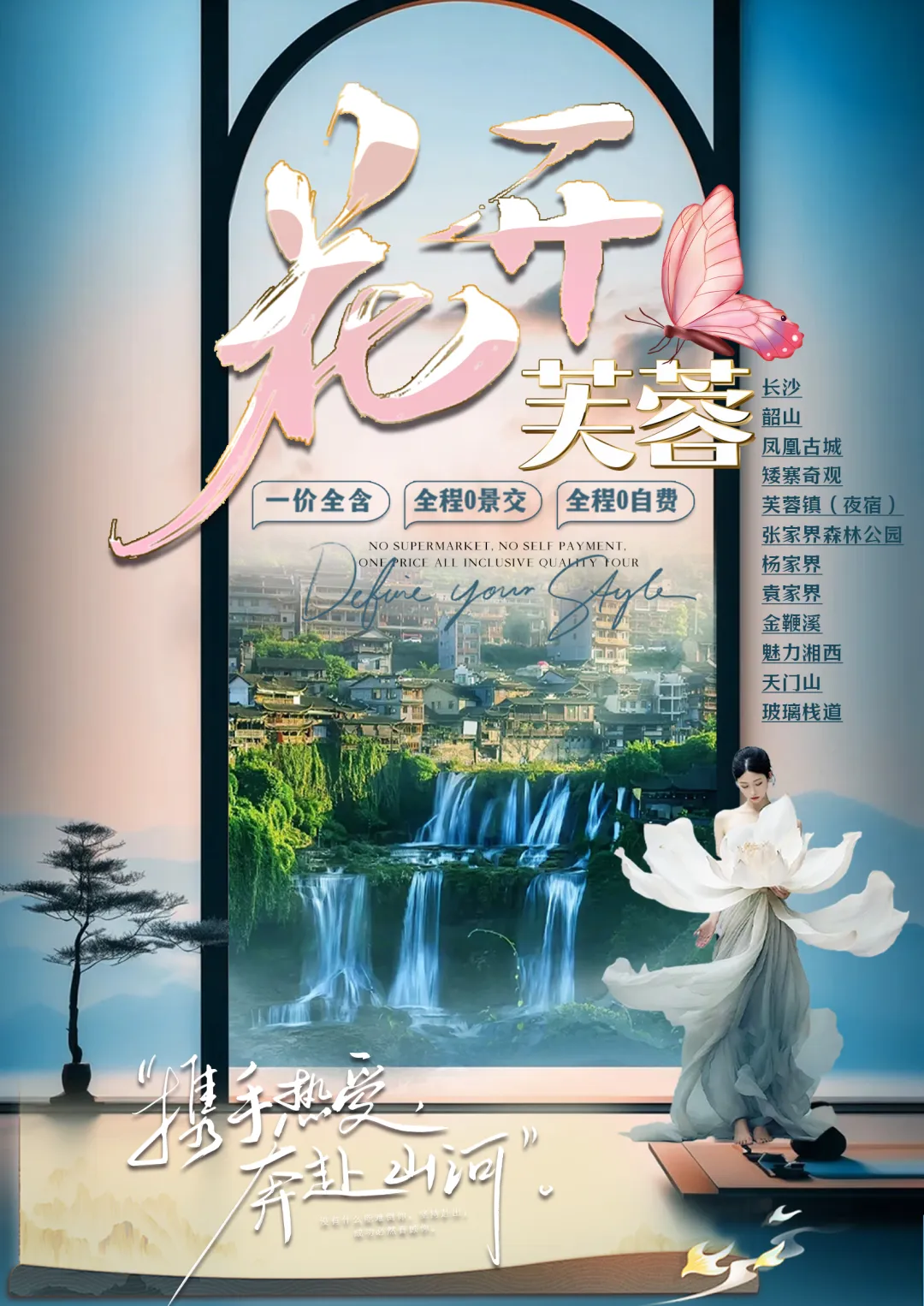 汽车赴网红打卡地【芙蓉古镇】(夜宿),山水如画,多情的酉水养育了世世代代的土家儿女,也造就了沿岸动人的风光,酉水画廊纳含着芙蓉镇的草木、山水、人儿,一道道美丽的彩虹是它编织的最美西兰卡普。这里得酉水舟楫之便,上通川渝,下达洞庭,素有“楚蜀通津”之称。因谢晋执导,刘晓庆、姜文主演的电影《芙蓉镇》在此取景而出名,于是人们便把此地叫做芙蓉镇。时代变迁,历久弥新,更因其独特的原始人文,静谧山水成为新时代湖南旅游新宠。芙蓉古镇大瀑布,酉水码头繁华依旧!
