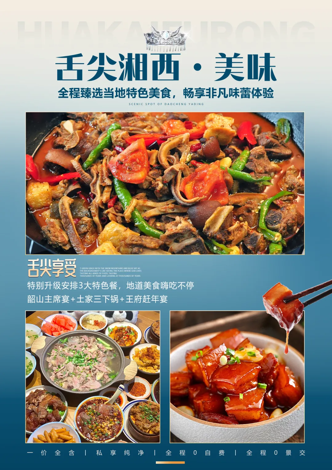 夜间赠送大型原创行浸式实景民族风俗演绎【花开芙蓉—毕兹卡的狂欢】(因景区赠送晚会,如遇堵车、下雨或官方停演及特殊原因不能正常观看无退费请谅解)呈现形式在中国旅游演艺中独一无二。观演是在独有的自然、人文环境中行进与沉浸相结合,室外与室内相呼应。其间你可见证千年前土王内心的强大和刚烈以及土王与楚王立柱为盟的场景。你可欣赏以祈福为目的的“梯玛神歌”、“土家铜铃舞”、“摆手舞”、“茅古斯舞”、“厄巴舞”等;你可听到迷人的“土家恋歌”、“哭嫁歌”。一条酉水长又长,芙蓉镇里好风光。人生难逢真美事,此刻不妨醉一场。