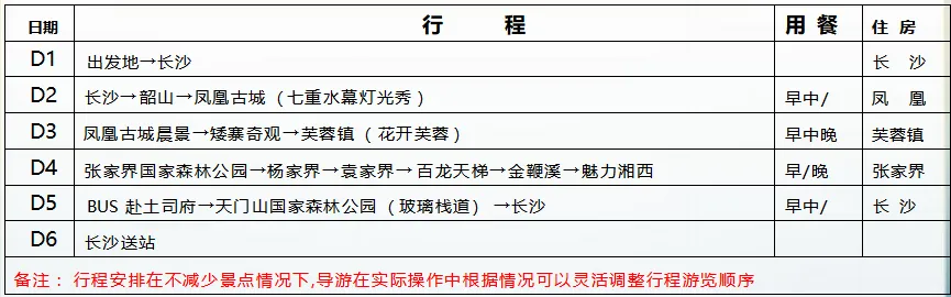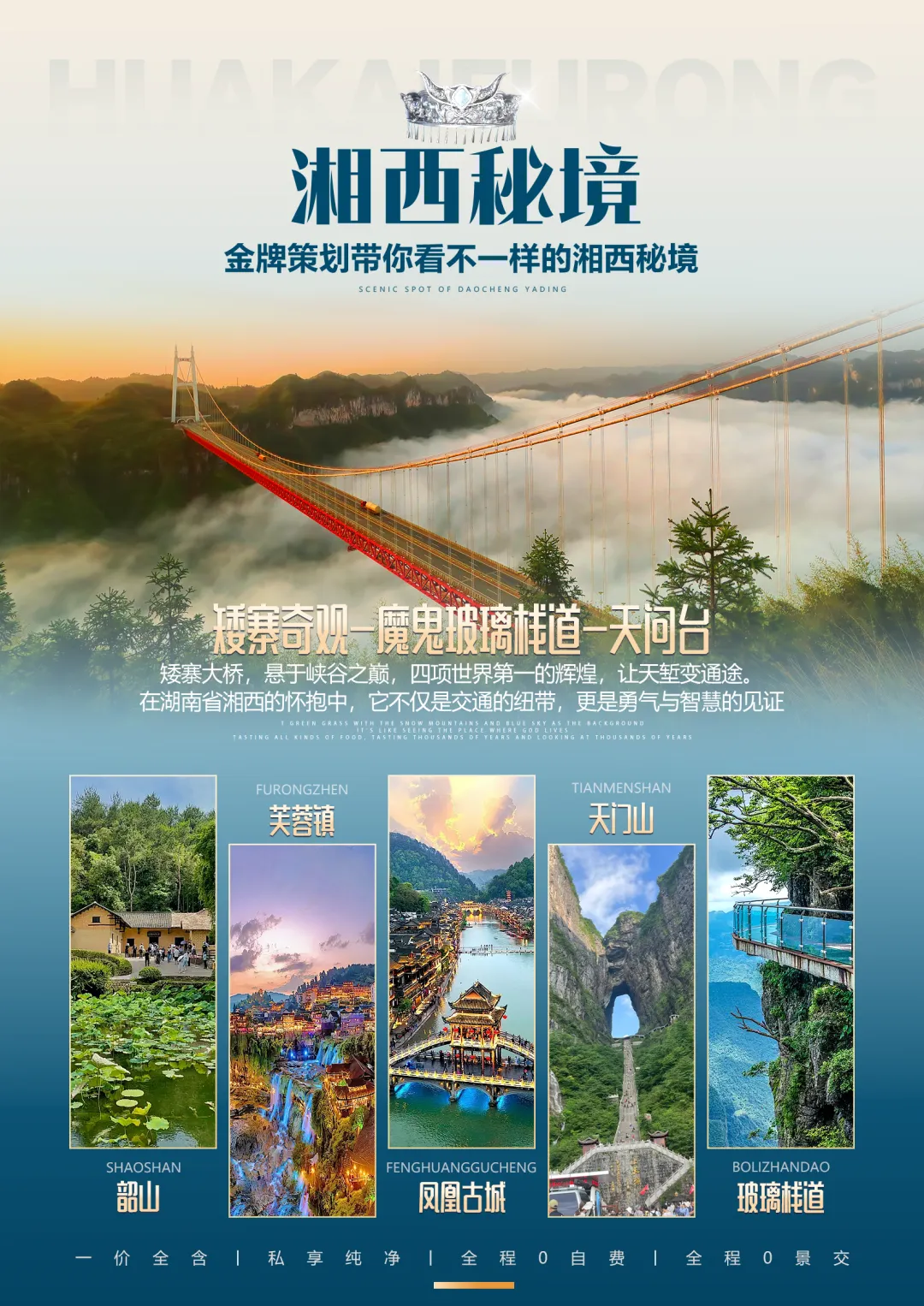 Day3:凤凰古城晨景→矮寨奇观→夜宿芙蓉镇(花开芙蓉)含餐:早中晚 住宿:芙蓉镇早体验和感受凤凰古城的九大精华:一座青山抱古城、一泓沱水绕城过、一条红红石板街、一道风雨古城墙、一座雄伟古城楼、一个美丽彩虹桥、一排小桥吊脚楼、一批闻名世界的人、一个国家级非遗文化遗产。漫步民俗风情街(翠翠街),看看那丰富繁多的手工艺品,品品那垂涎欲滴的当地小吃,更是让你流连忘返。湘西非物质文化遗风扑面而来,赏传承人作品,品百年老号姜糖,吃苗家血粑鸭,再喝上一口香醇的苗家酒,不亦乐乎!黄永玉的风水巨型雕塑“犟牛座”屹于街心,让您站在这块风水宝地上同时吸纳大师的风范气息。百年历史“凤凰苗族白银锻造工作站”,使您湿身银的海洋,博远的苗银文化之中有您的身影,以“牛角梳”为代表的苗族“文书”文化,更是奇而不俗,意味深长......
